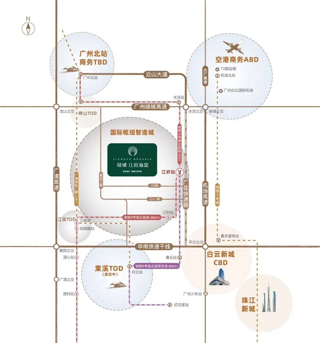 项目交通极为便利,堪称交通枢纽。双地铁优势明显,8 号北延线/北延支线交汇处江府站距离项目仅 800 米,四站可达白云湖,五站直达白云新城,半小时内通达越秀天河等地,快速连接城市核心区域。广花快速路为双向 8 - 10 车道,全程无红绿灯,时速 60 - 80 公里,15 分钟通达白云新城,30 分钟直达珠江新城,出行效率极高。广清高速水沥出口距离项目约 5 分钟车程,快速接驳广州各区。广清城轨二期江高站链接棠溪 TOD,5 分钟即达,便捷的交通网络让业主出行无忧。